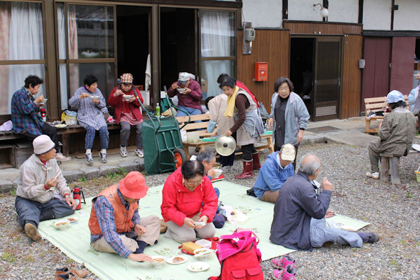 作業後はとん汁とヤマメの塩焼きを準備し、持参したおにぎりでそばパートナーの皆さんと食事